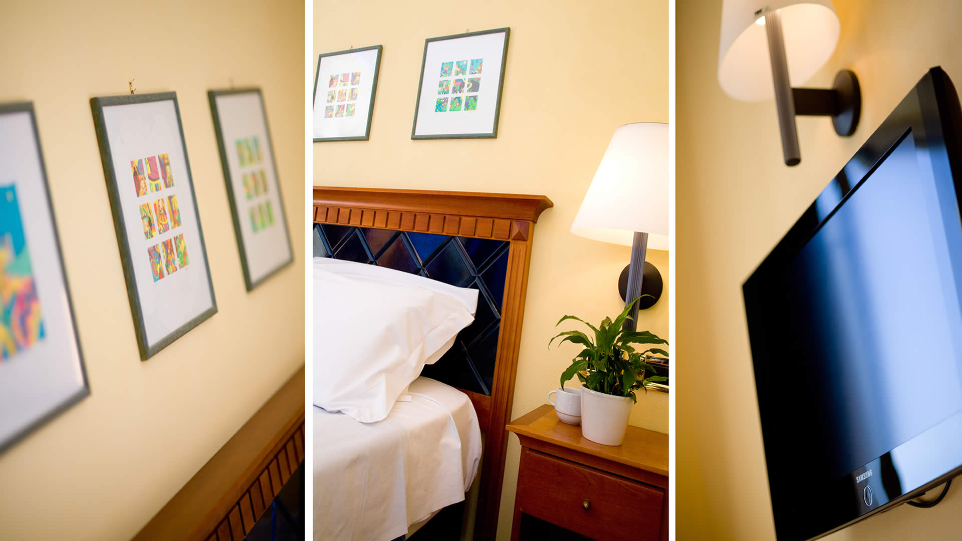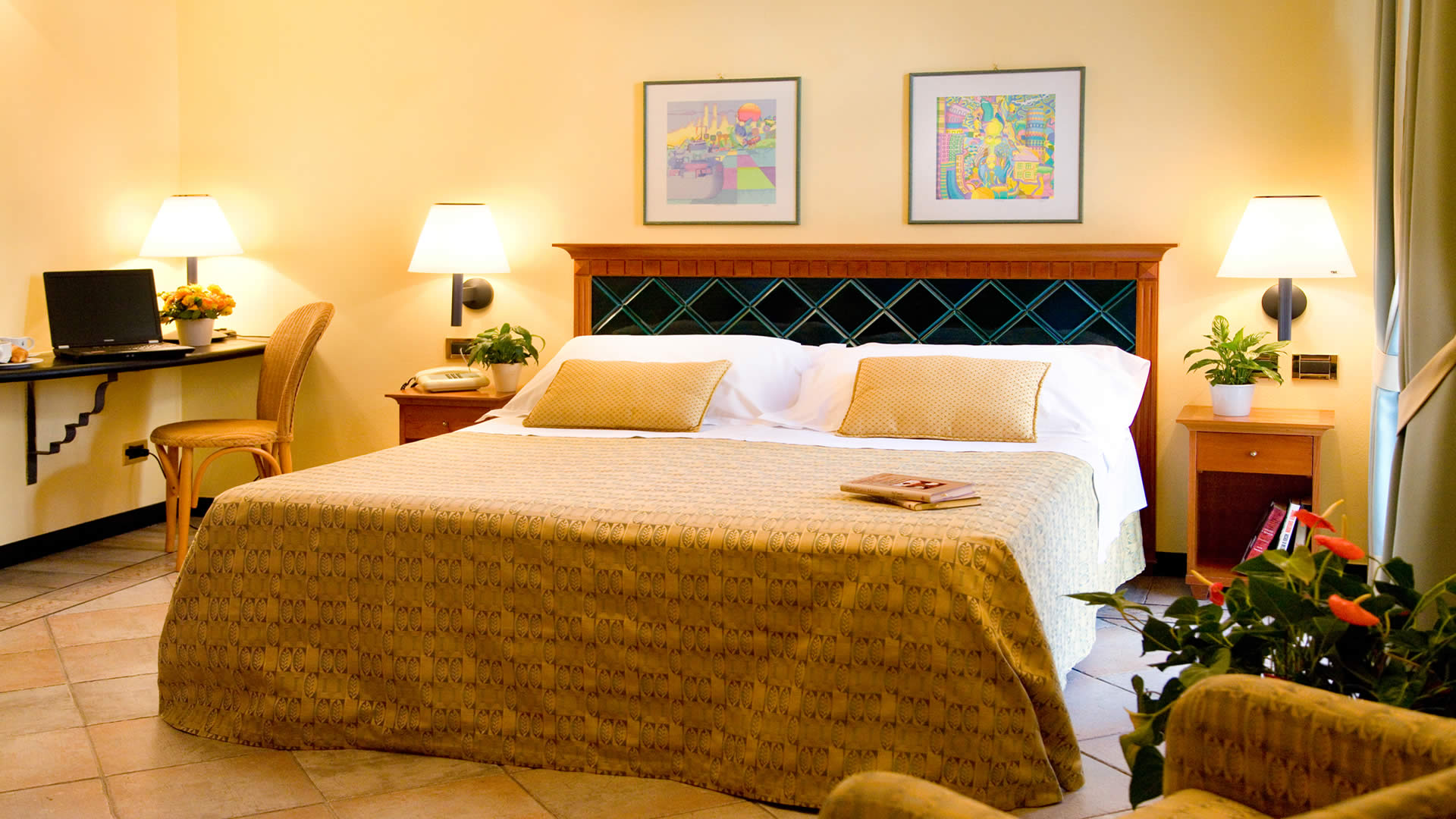 La camera, di circa 16–20 mq, è situata sul lato interno ed è dotata di finestra. Dispone di serratura elettronica, TV LCD con collegamento satellitare e FREE SKY, riscaldamento e aria condizionata a controllo individuale, minibar, cassaforte e connessione Wi-Fi gratuita.