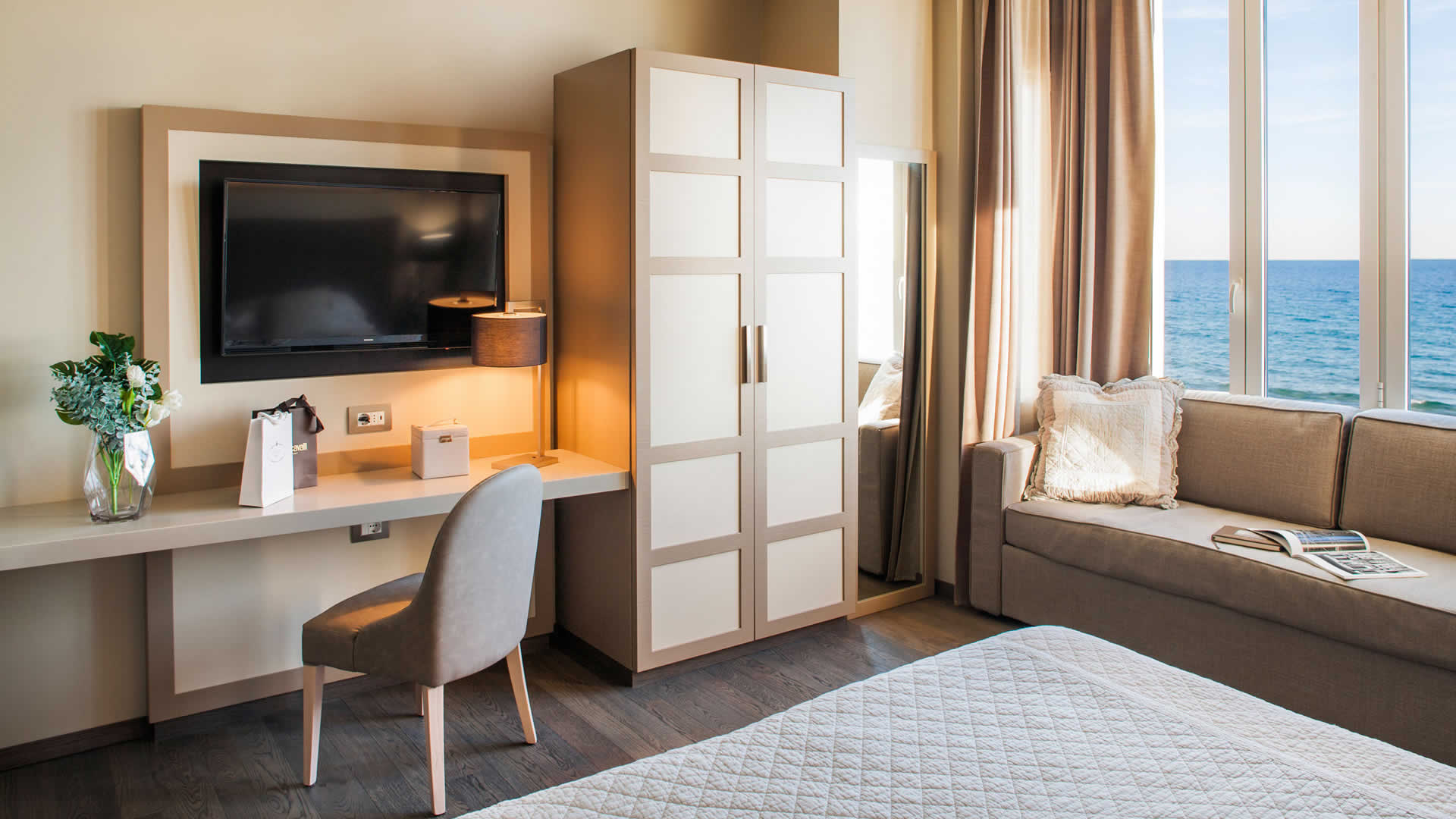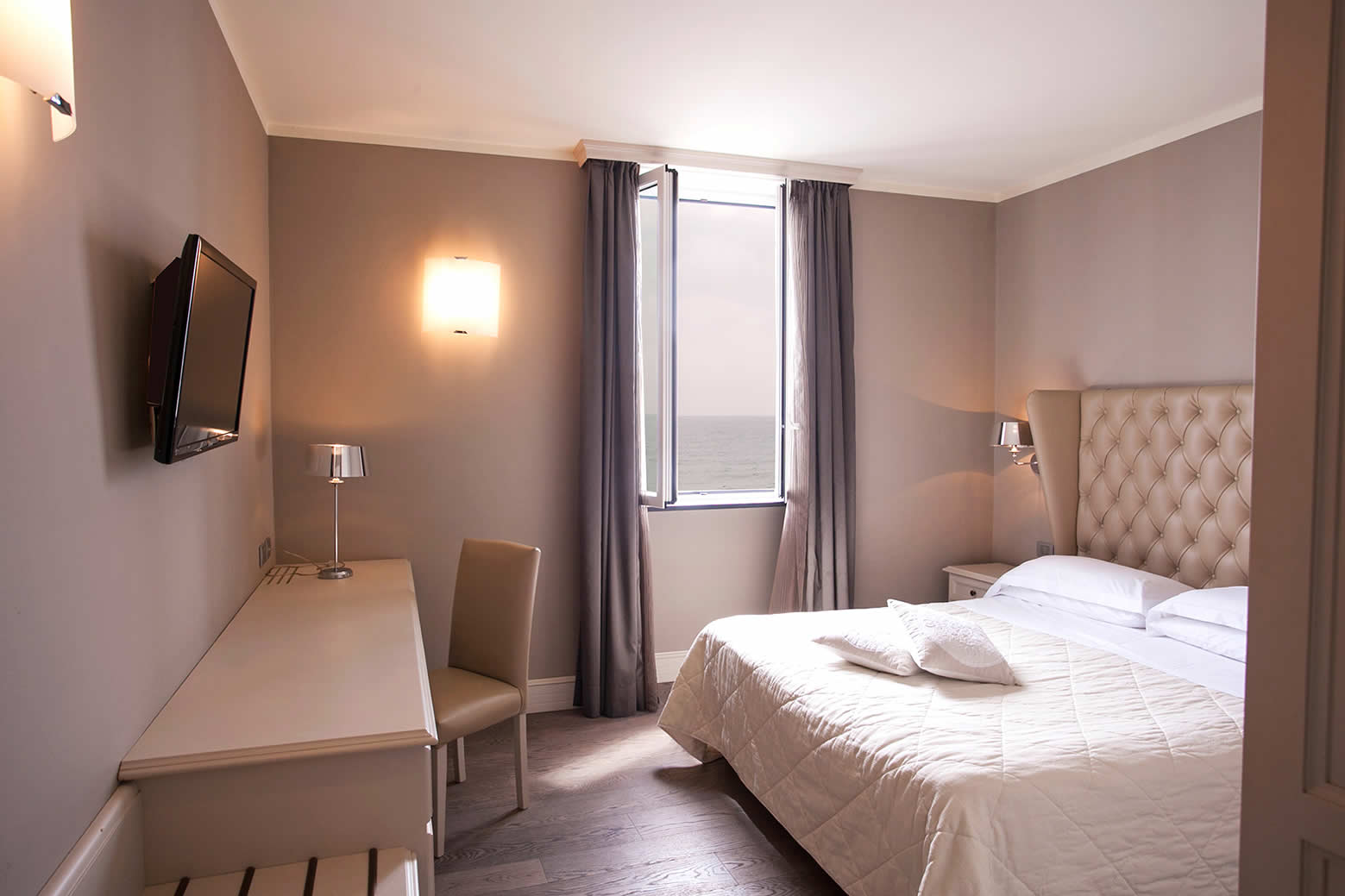 Situate sia in Hotel che nella nostra dependance "Piccolo Savoia". La superficie della camera è di circa 24/30 mq, arredata con stile, fronte mare, dotata di serratura elettronica, TV satellitare, riscaldamento e condizionamento con controllo individuale, minibar, cassaforte, WIFI gratuito; è presente il bagno con grande doccia, set di cortesia, pantofole, asciugacapelli, bollitore elettrico.