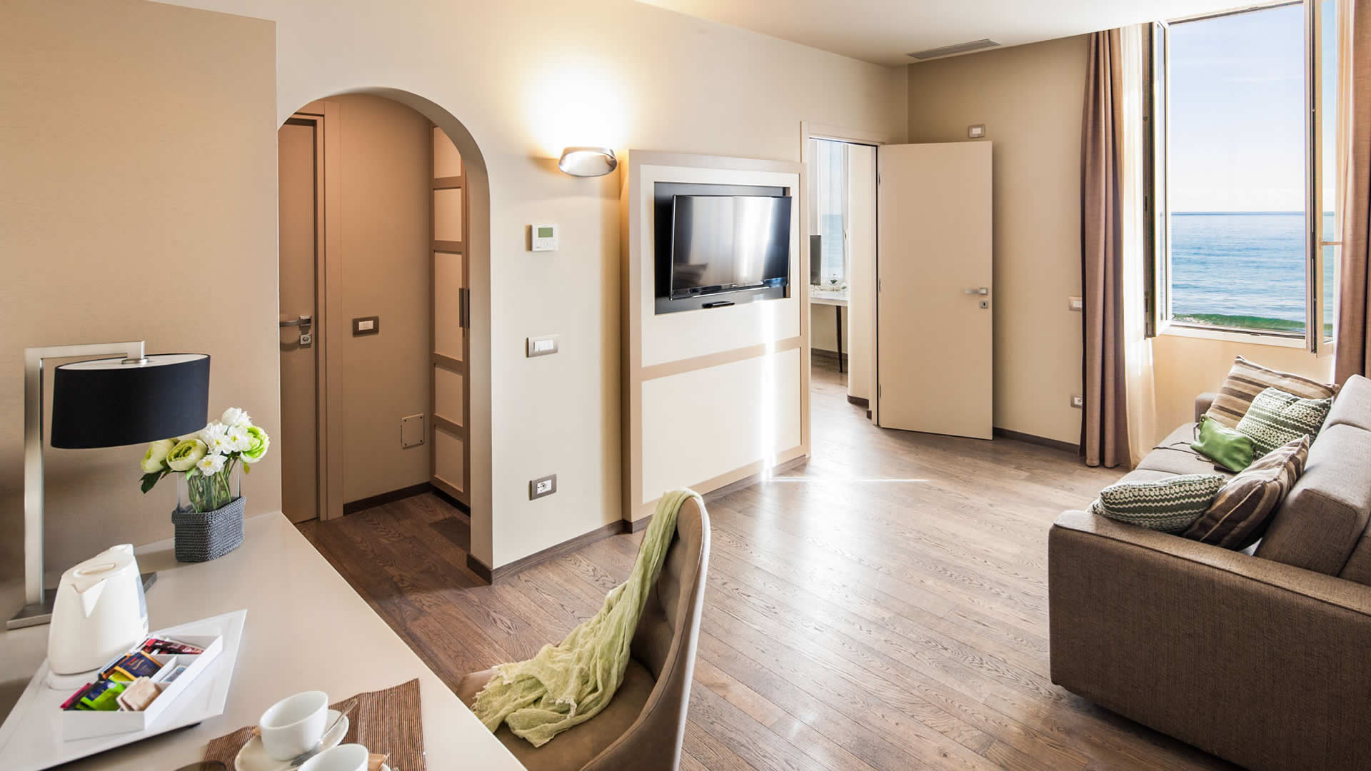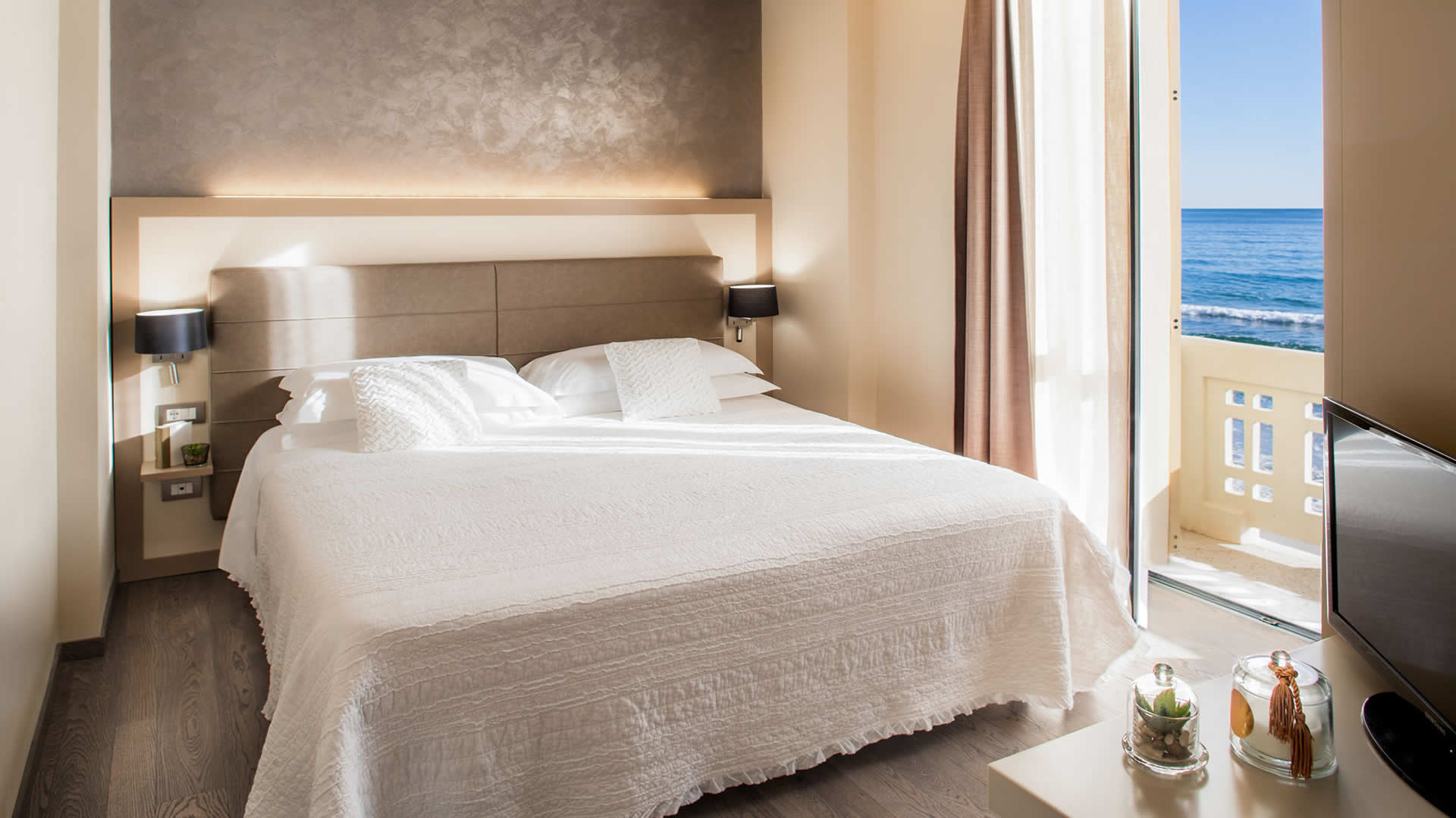 Situate sia in Hotel che nella nostra dependance "Piccolo Savoia". La superficie della camera è di circa 24/30 mq, arredata con stile, fronte mare, dotata di serratura elettronica, TV satellitare, riscaldamento e condizionamento con controllo individuale, minibar, cassaforte, WIFI gratuito; è presente il bagno con grande doccia, set di cortesia, pantofole, asciugacapelli, bollitore elettrico.